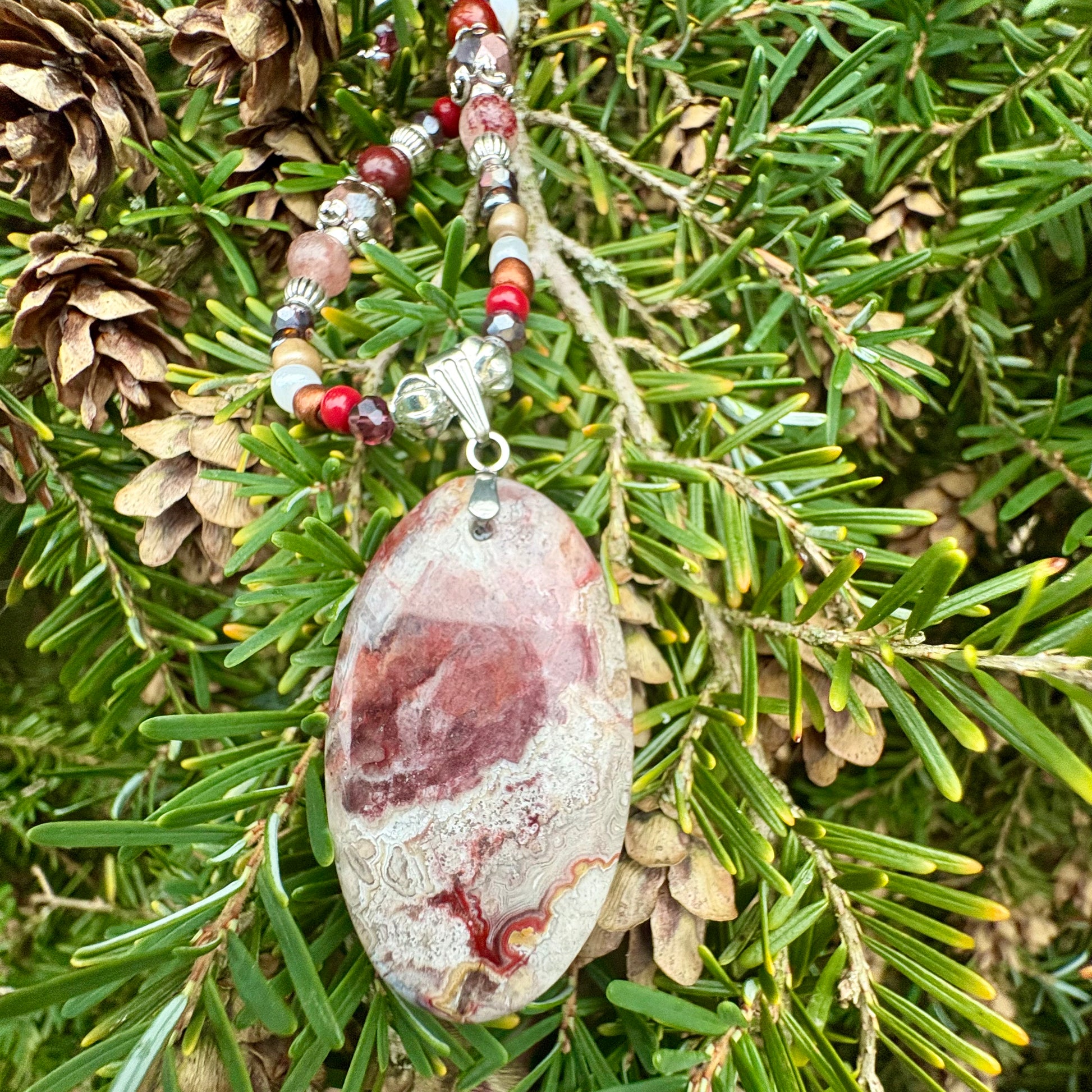 This Crazy Lace Agate Beaded Necklace boasts a beautiful and unique crazy lace agate pendant that is sure to catch the eye. The beaded string is securely held by a 12lb weight acrylic line and is complemented by nickel free findings for sensitive skin. At 24 inches long, this necklace is a stunning addition to any jewelry collection. This necklace is truly one of a kind.