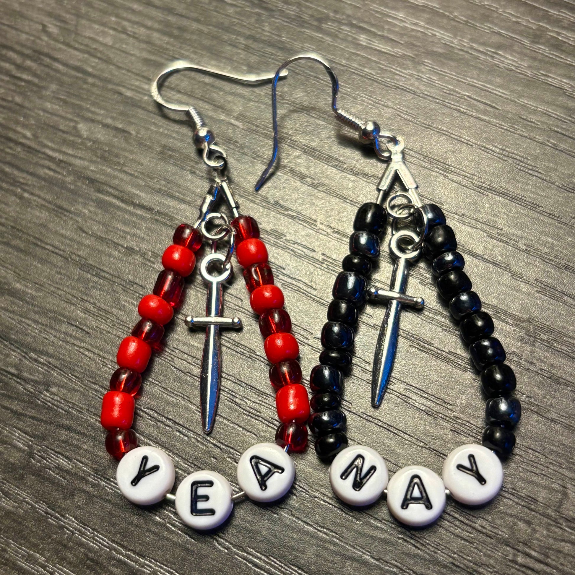 Inspired by the signs and the dagger motif from the Long Live the Black Parade tour, these Elexecution Earrings are perfect for any MCR fan. Wear them to the tour next year! Can switch out the hooks to lever backs or clip-ons for more security in the pit, just leave a note at checkout. They are just over 2 inches long with 925 sterling silver plated hooks, nickel free.