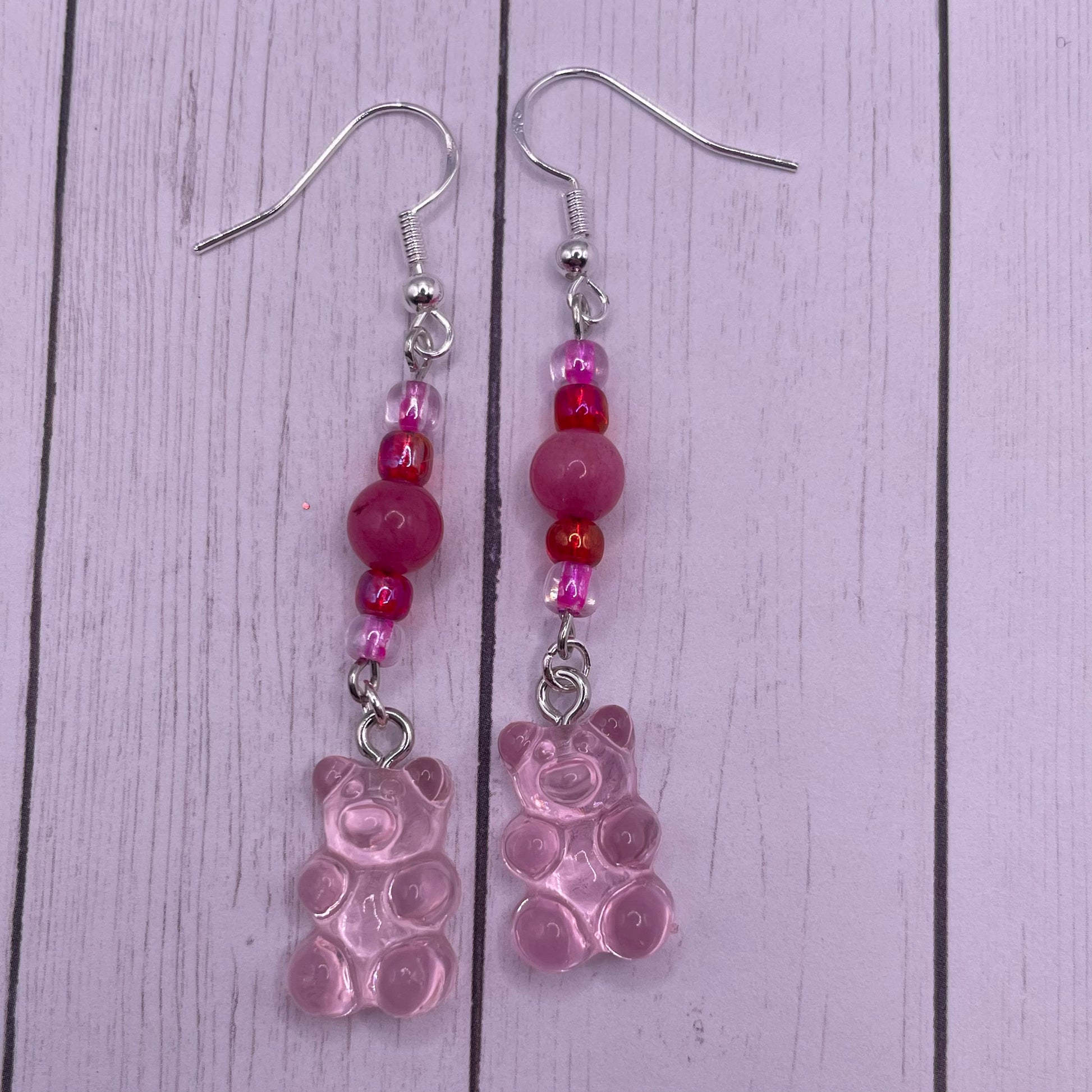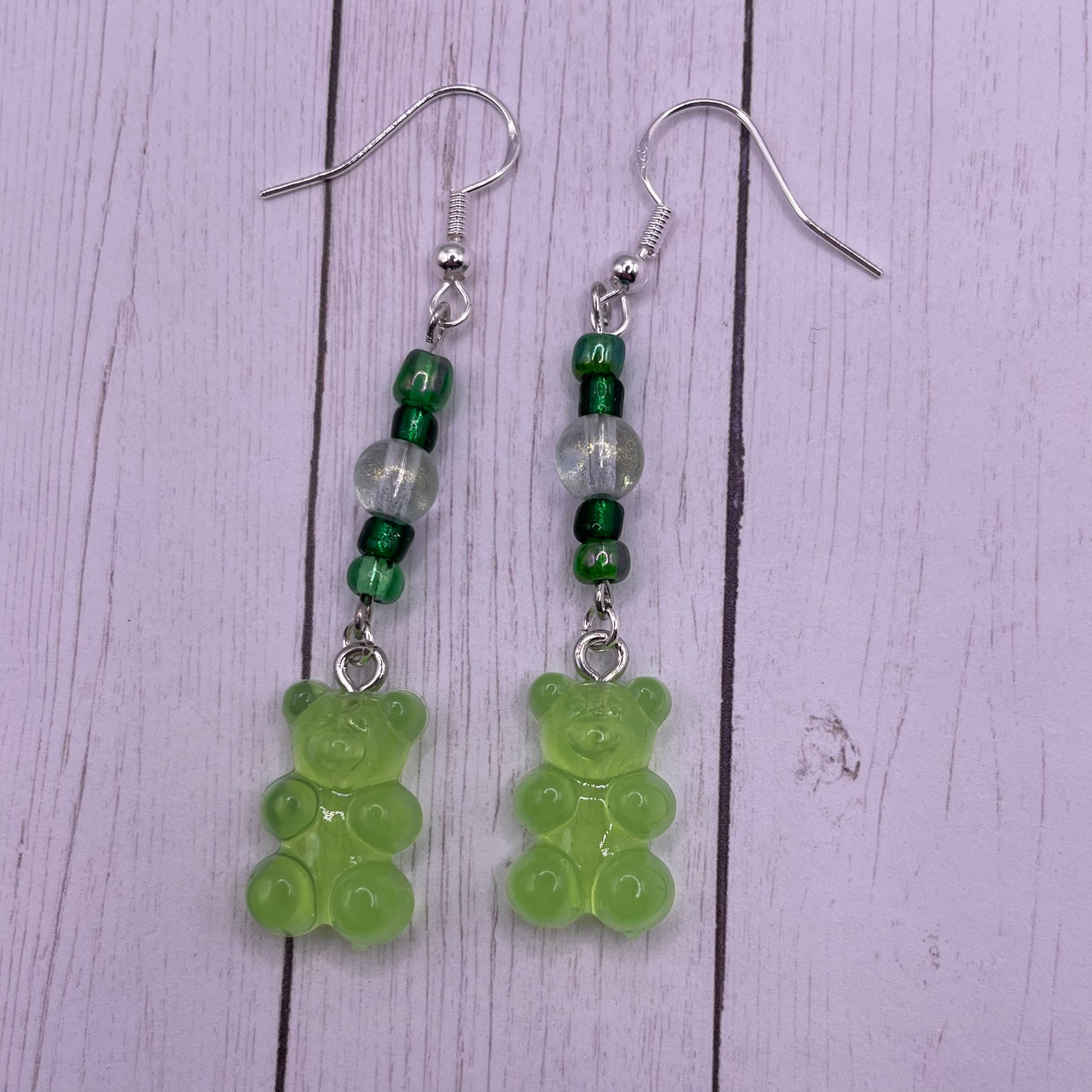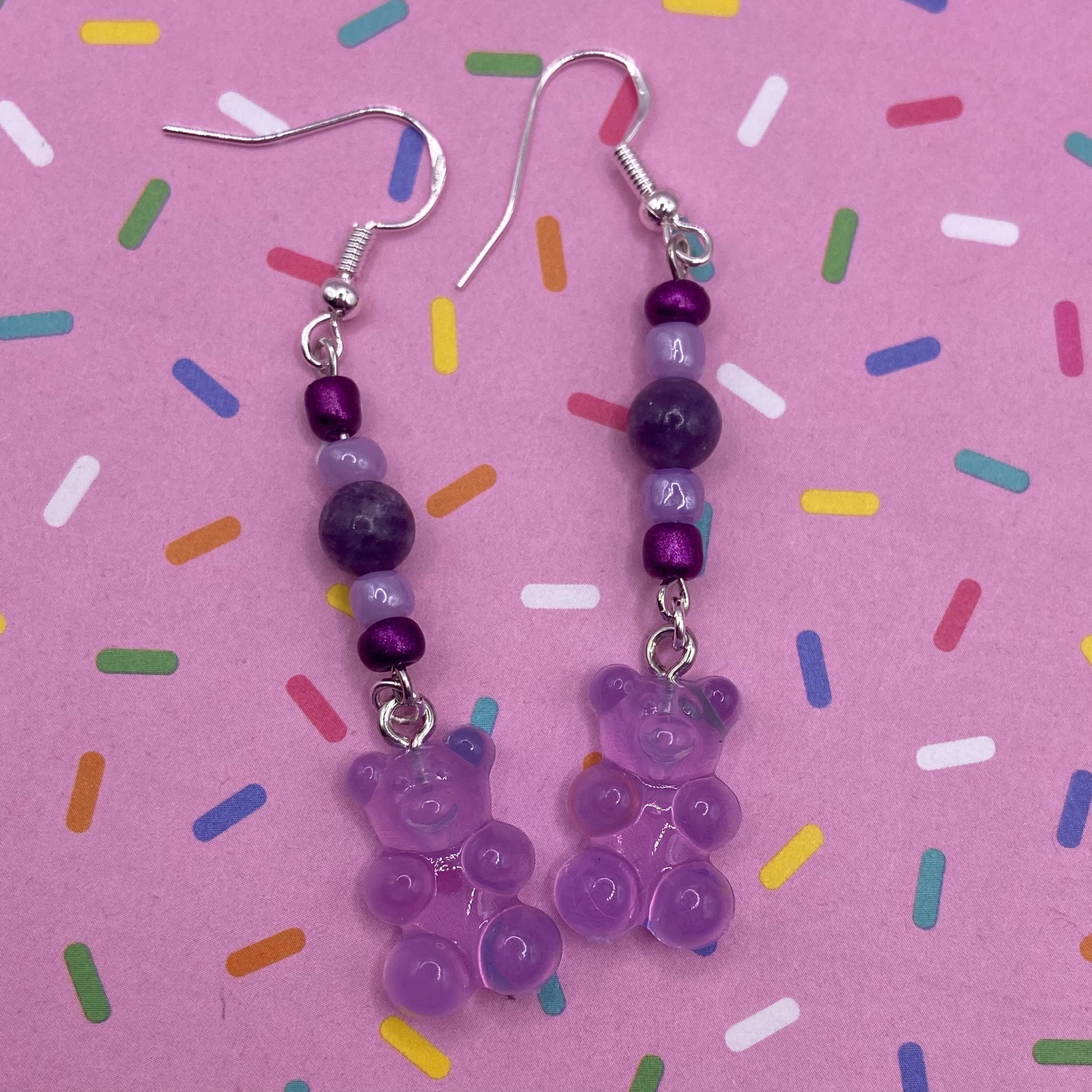 What’s your favorite color gummy bear? Show it off with these candy earrings! 2.5 inches from top of hook to the bottom of the charm. Made with seed beads, 6mm crystal beads, plastic charms, and silver plated hooks.