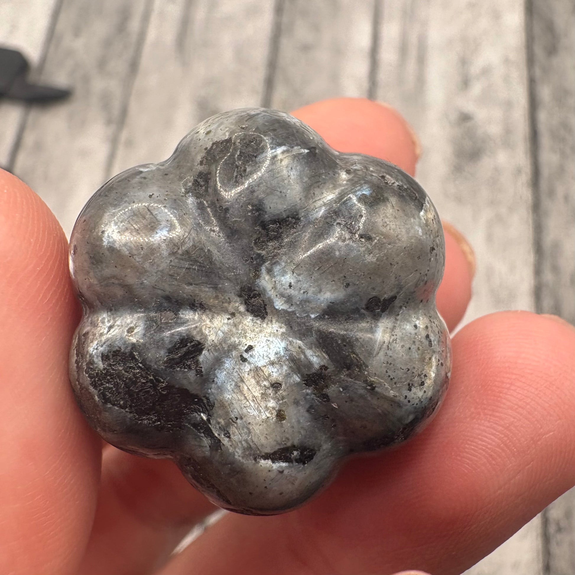 1 inch pumpkin carving made from flashy Larvikite! Silver stem glued into the carving.