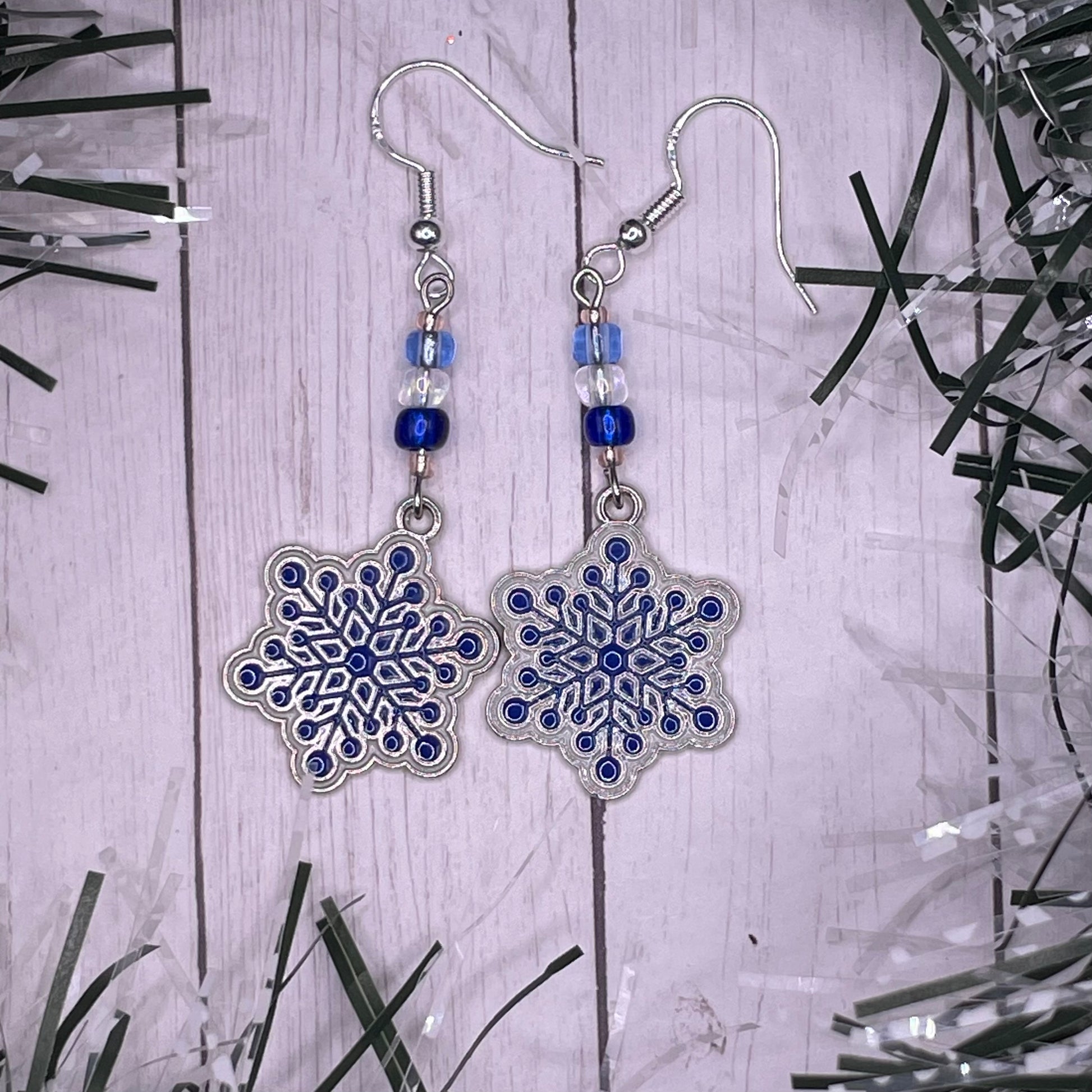 Looking for some cute winter snowflake earrings? Look no further! All made with silver plated, nickel free hooks; silver colored alloy enamel charms; and glass beads.