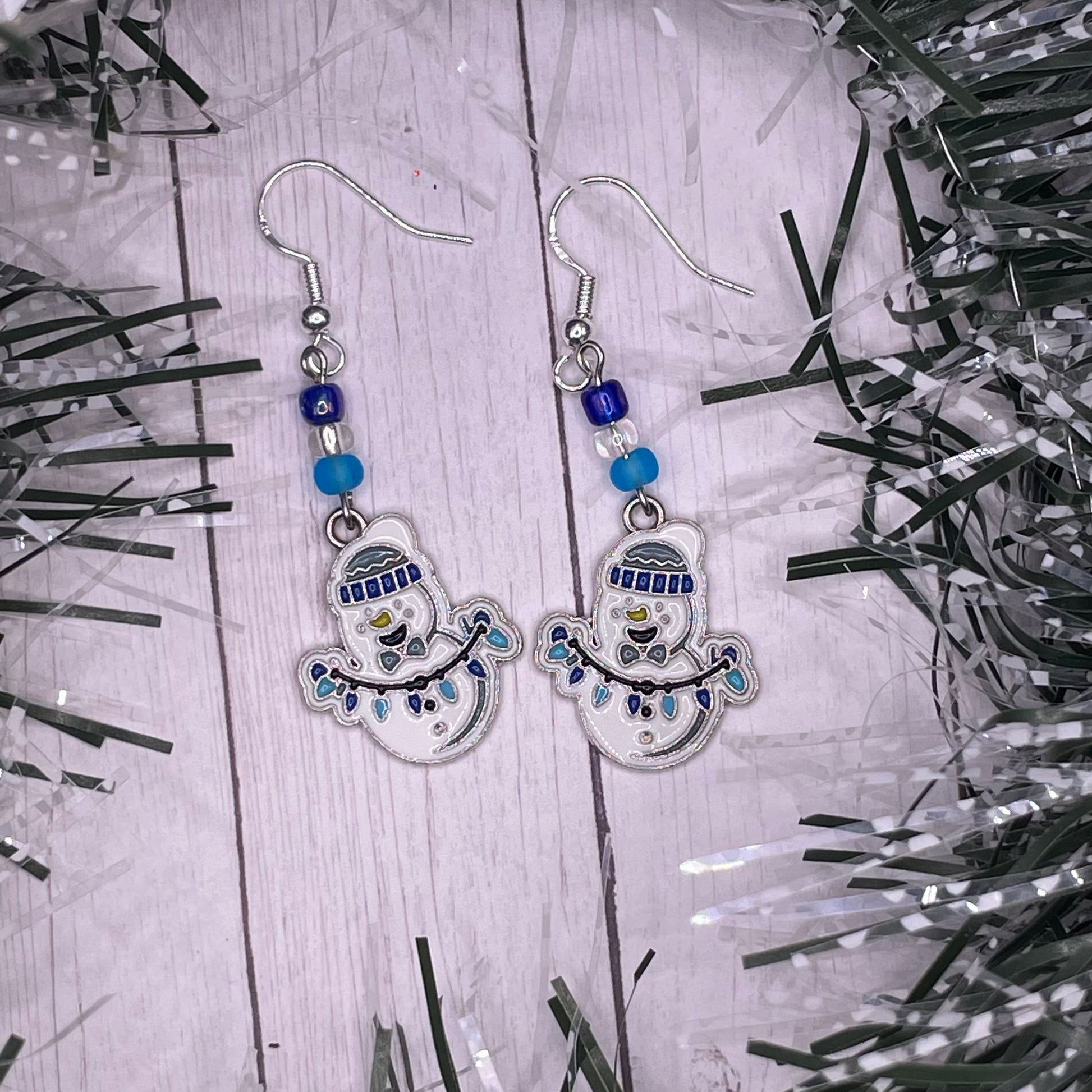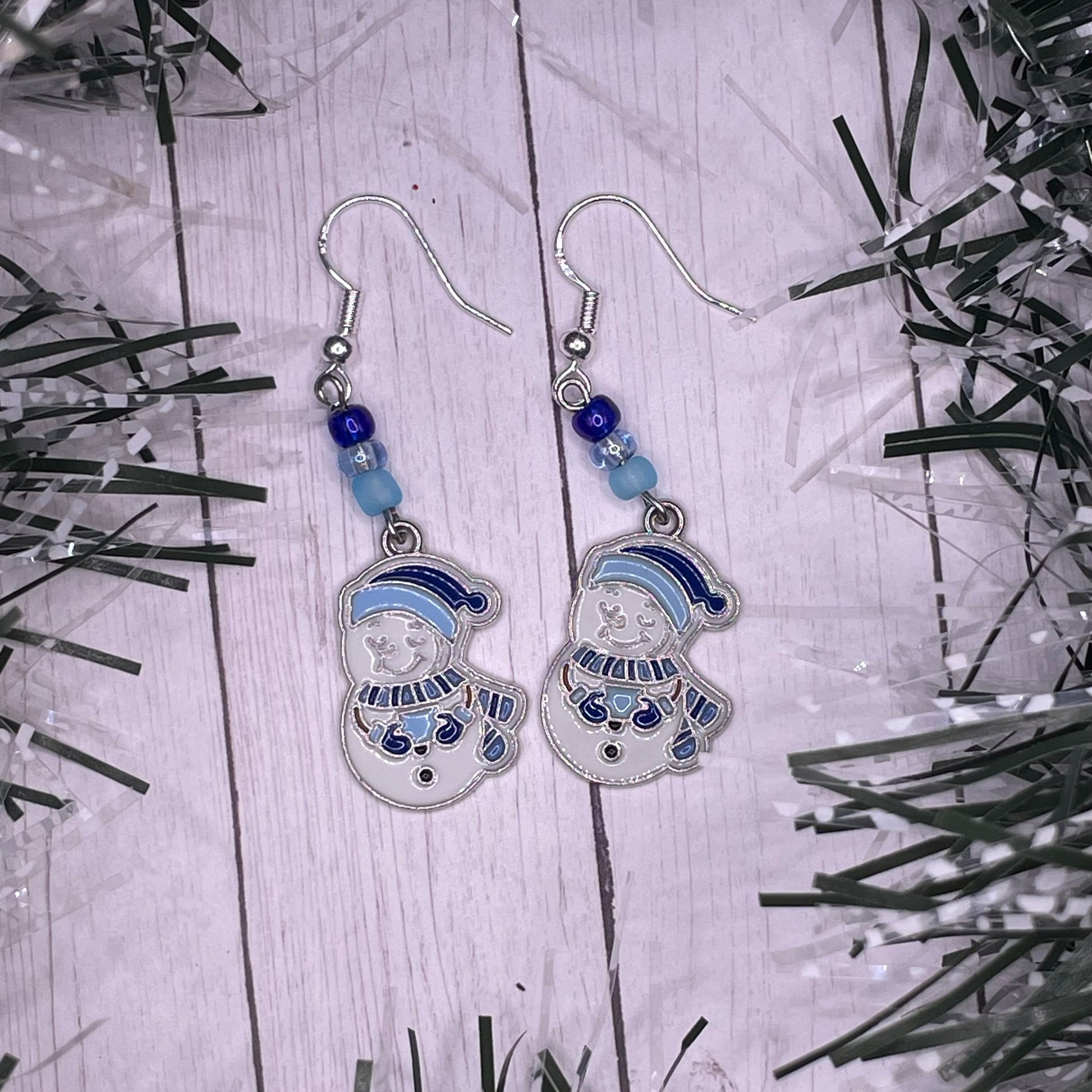 Looking for some cute winter snowman earrings? Look no further! All made with silver plated, nickel free hooks; silver colored alloy enamel charms; and glass beads.