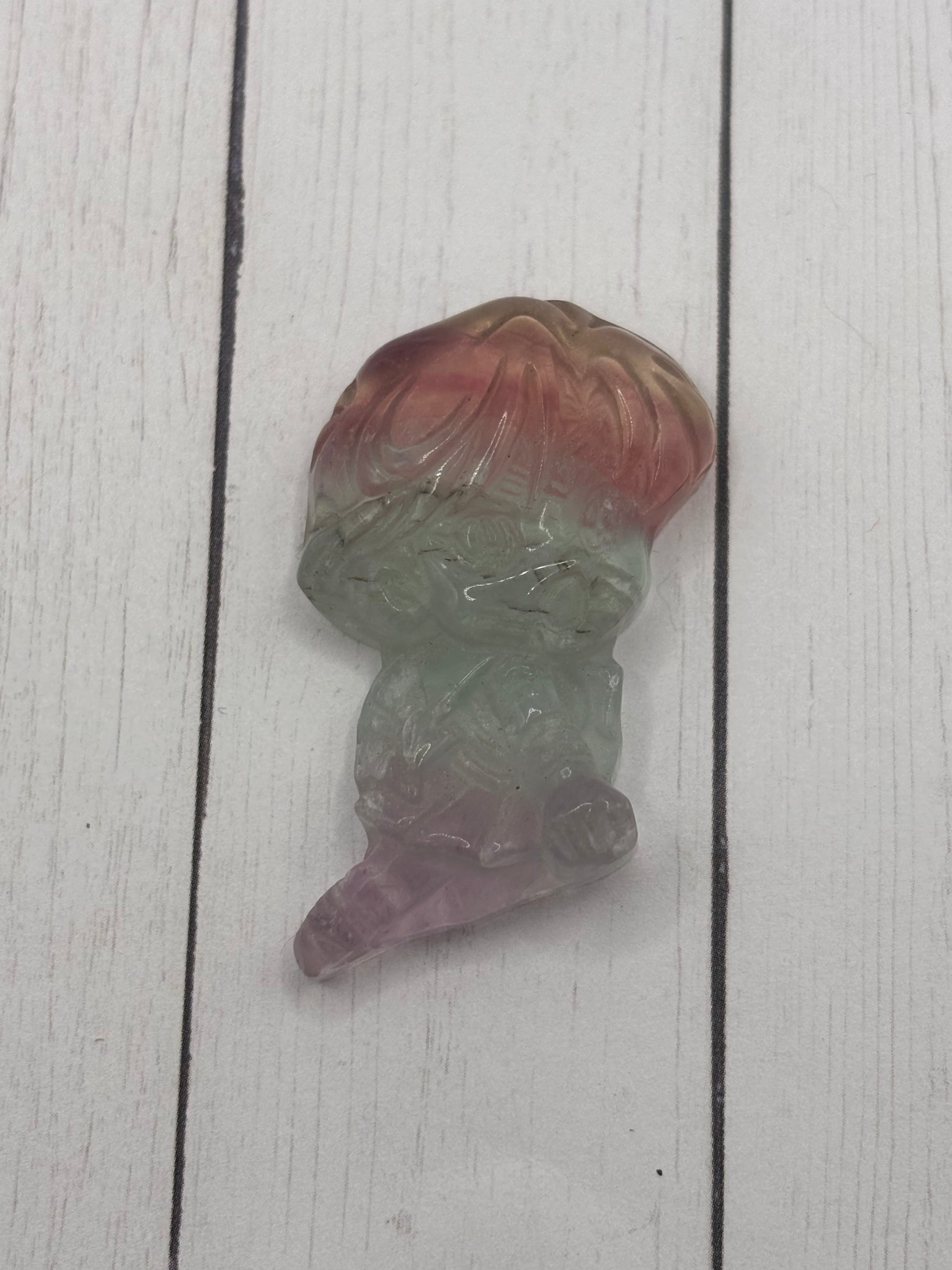1 inch rainbow fluorite Carving Of our favorite blue haired senshi! This carving lays flat, or you can prop it up on the little plastic stand that it comes with!